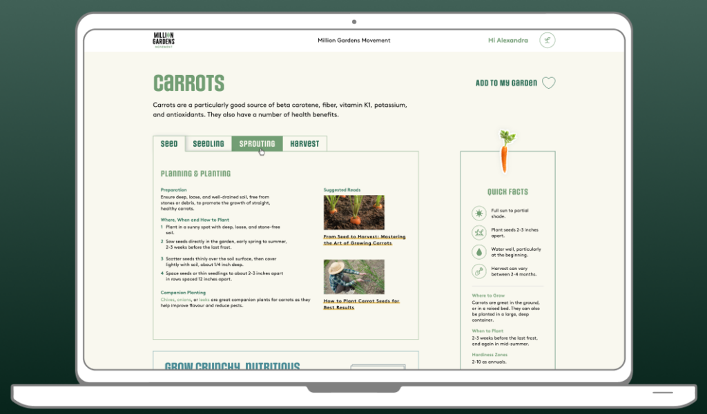 This digital platform is optimized for mobile use, ensuring that users have access to information and support whenever they need it. With features like a quiz-style decision tree, the platform makes it easy for users to decide what to grow, catering t o both seasoned gardeners and novices alike.