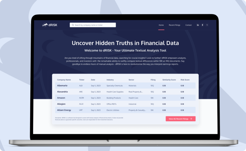 dRisk transformed the way investors analyze stock performance by leveraging AI and machine learning. Through our partnership, we developed a cutting-edge platform that streamlined data analysis, generated actionable insights, and created a unique product offering – Flash Reports. This collaboration showcases the power of our fractional CTO services in driving innovation and market disruption.