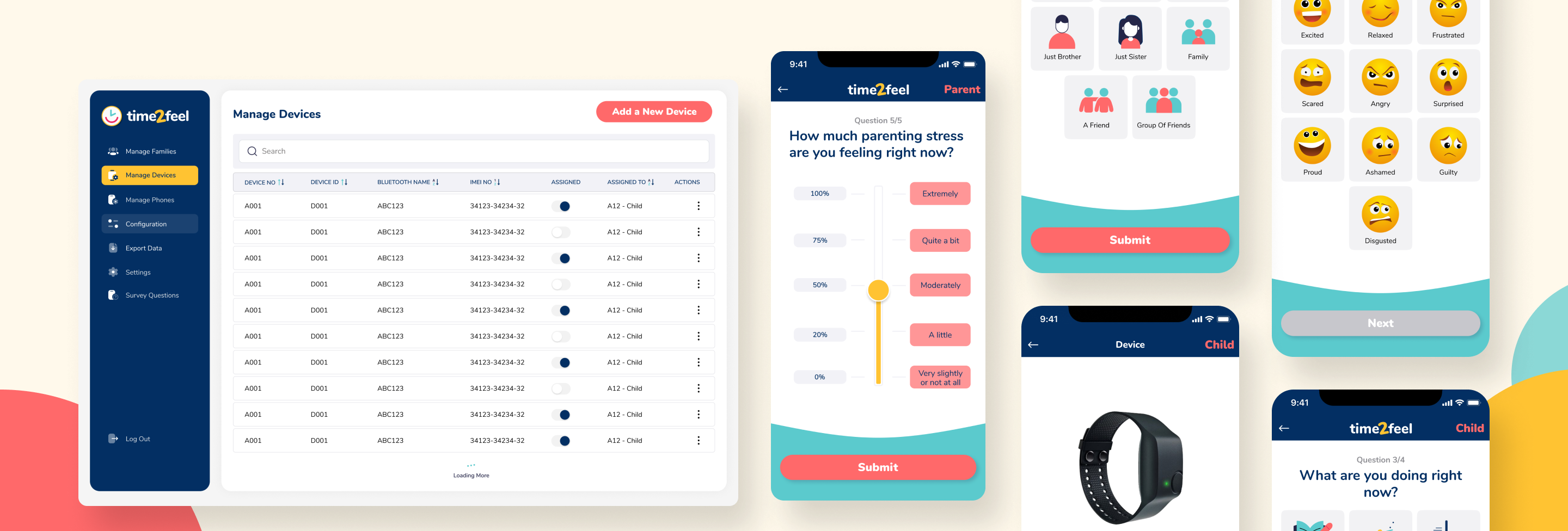 The Time2Feel app is built with a deep understanding of Dr. Kristel Thomassin’s research requirements, combining the power of wearable technology with intuitive mobile and web applications. We focused on streamlining data collection and enhancing the research experience for both participants and researchers.